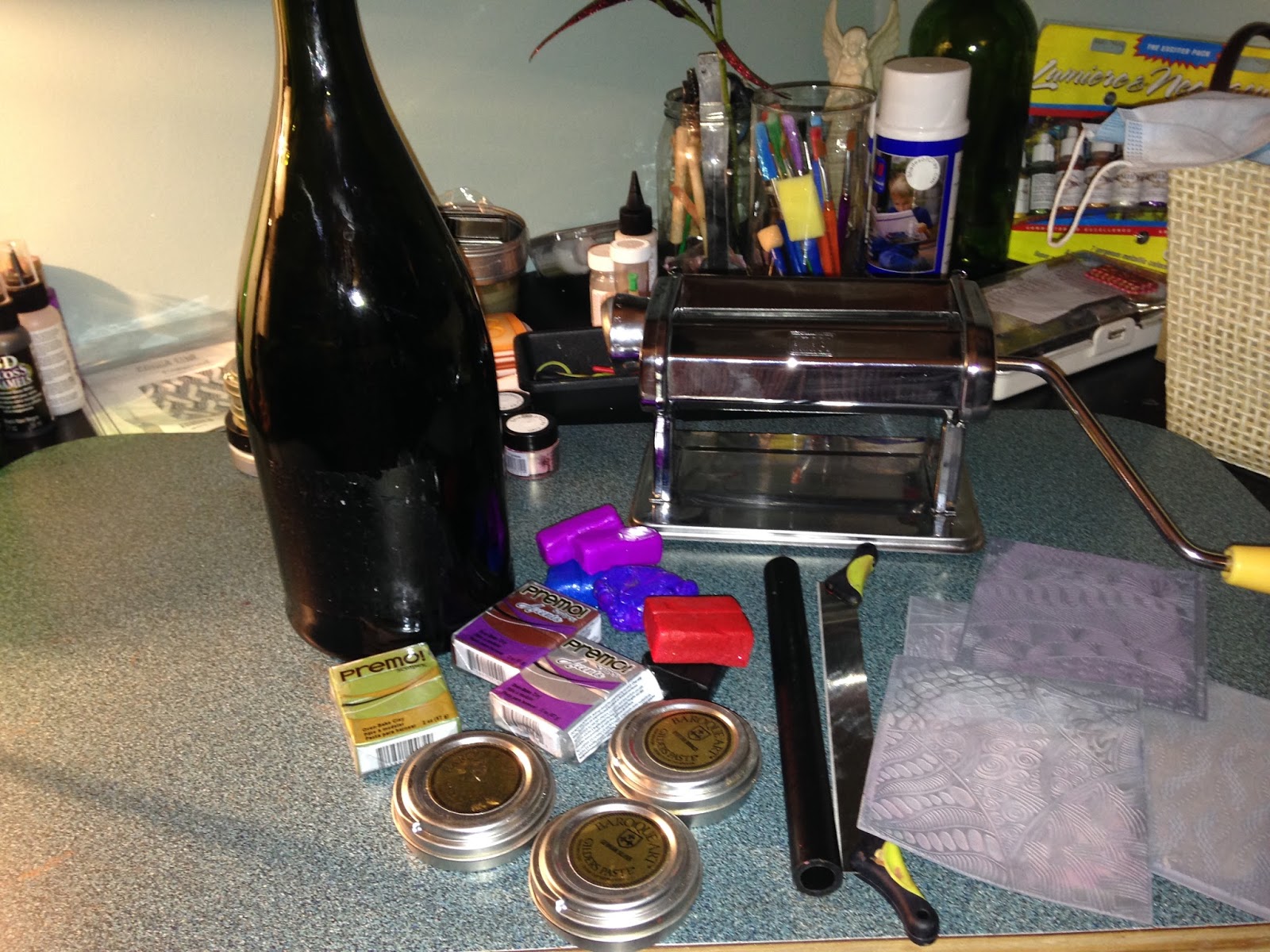 Here's how it looks after running it into the pasta machine. I wanted to create a distress look so I tear the sides of the clay before placing it on the bottle.