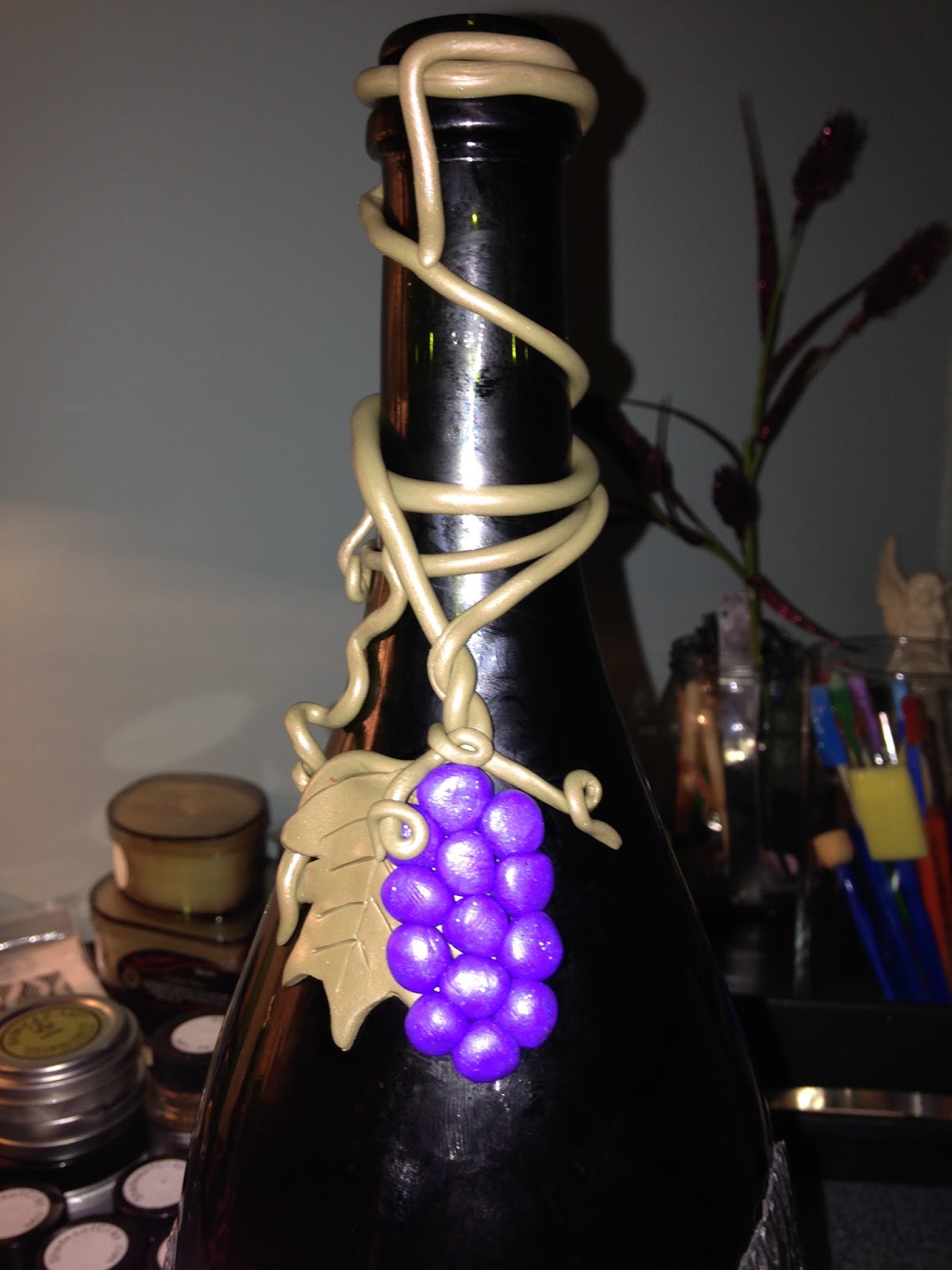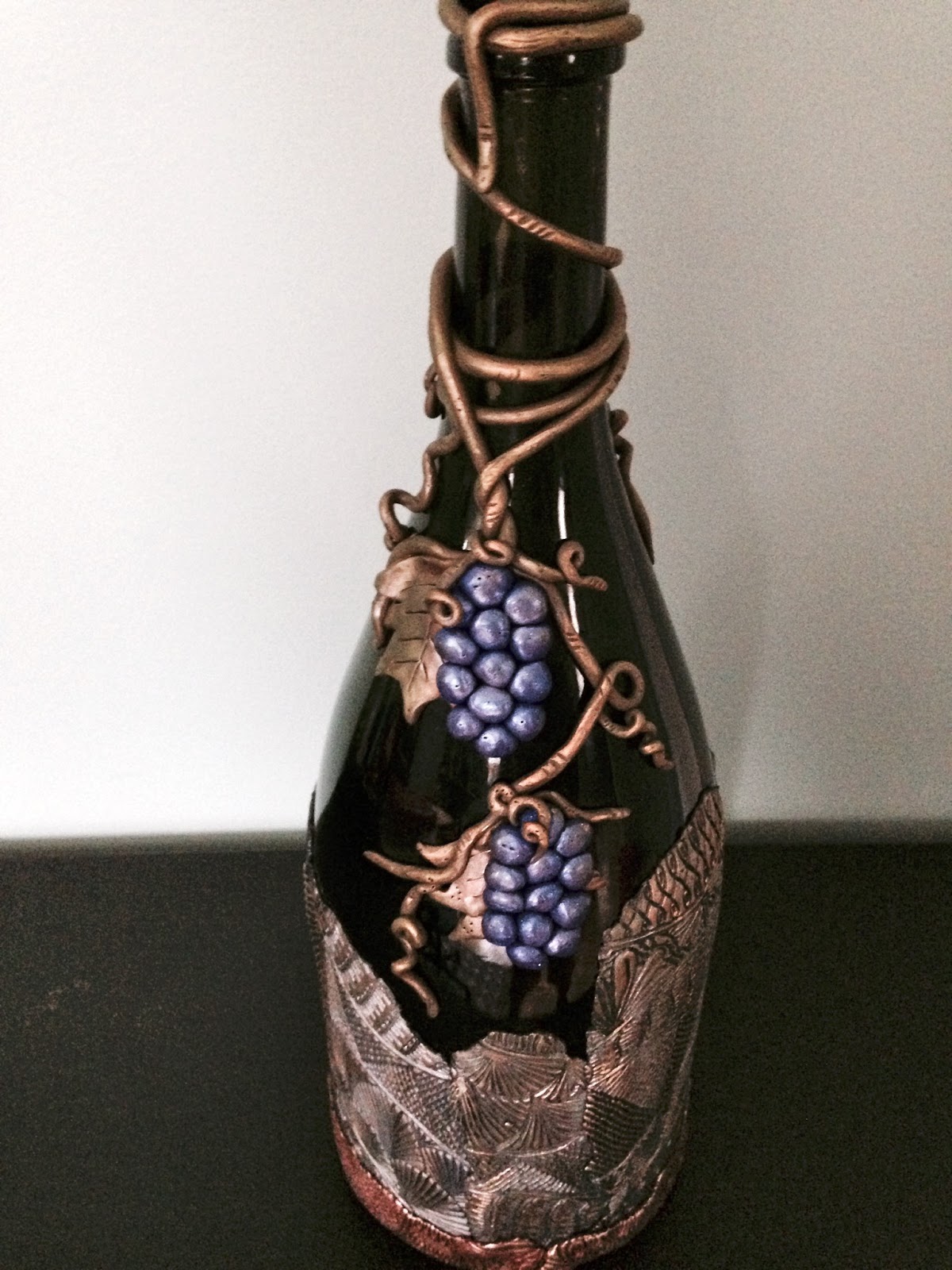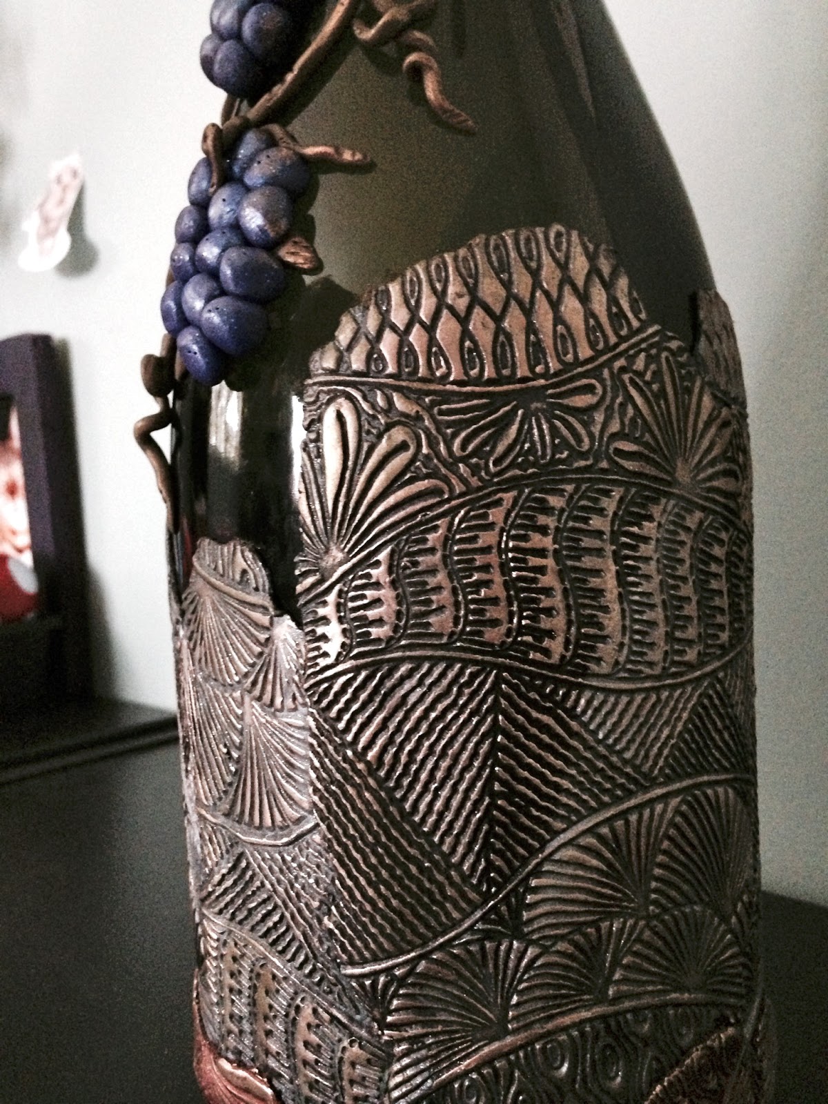 Beautiful work! You have created numerous gorgeous pieces. I love how you used grapes and vines on this bottle. I will be sharing this on my morning Facebook feature tomorrow. Thank you for sharing your works.
