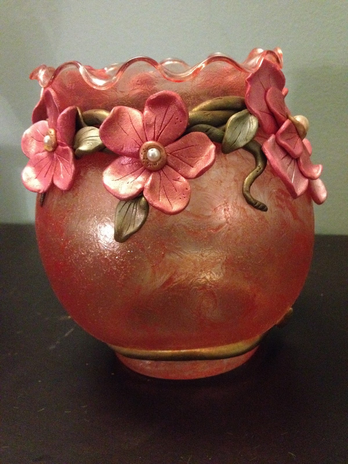 I wanted to create something different and I decided to combine glass painting and polymer clay. These are my frosted vases with polymer clay design.