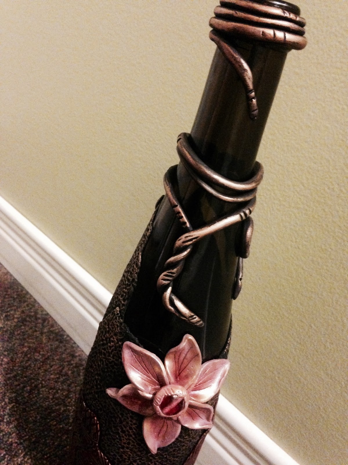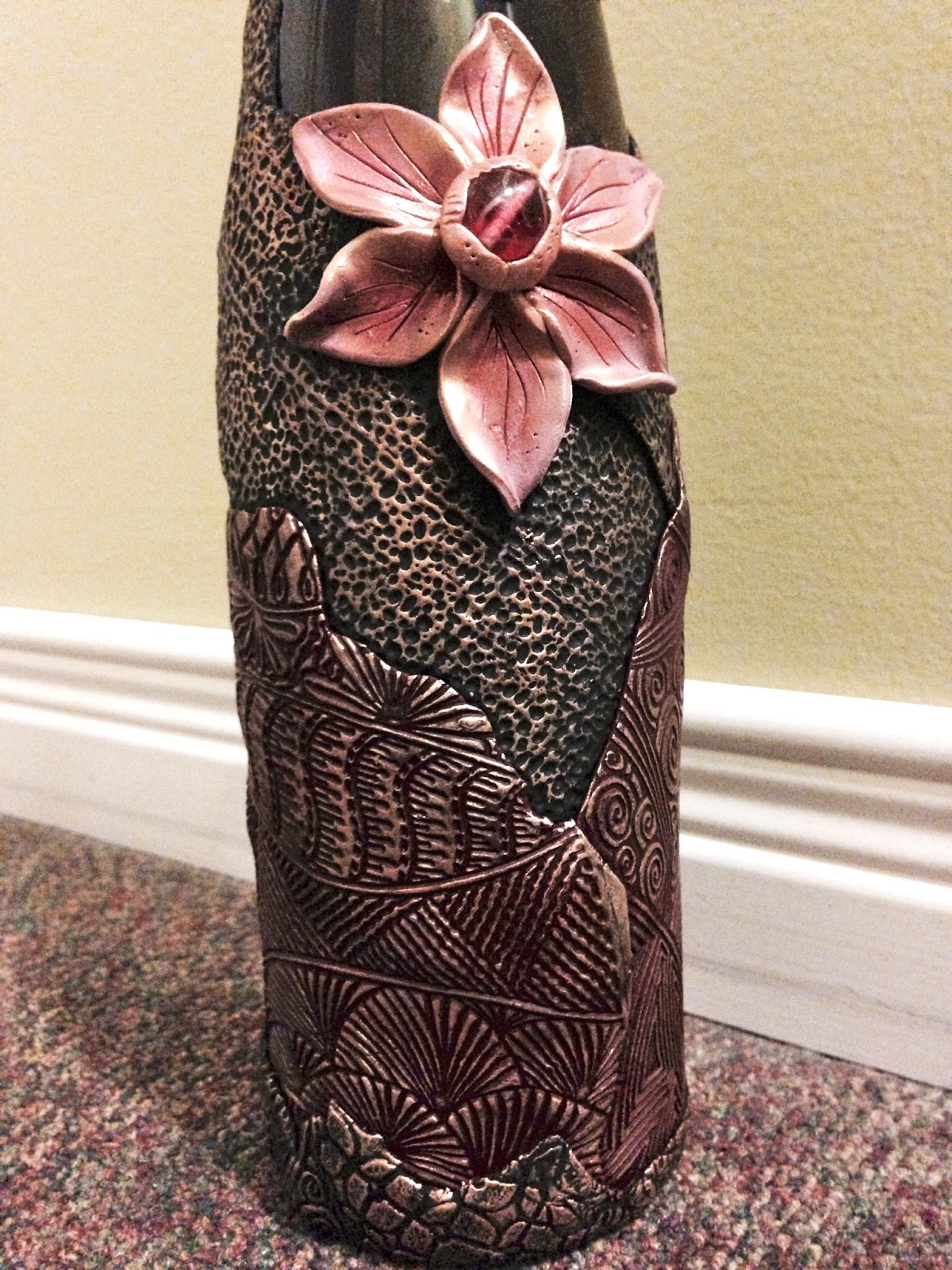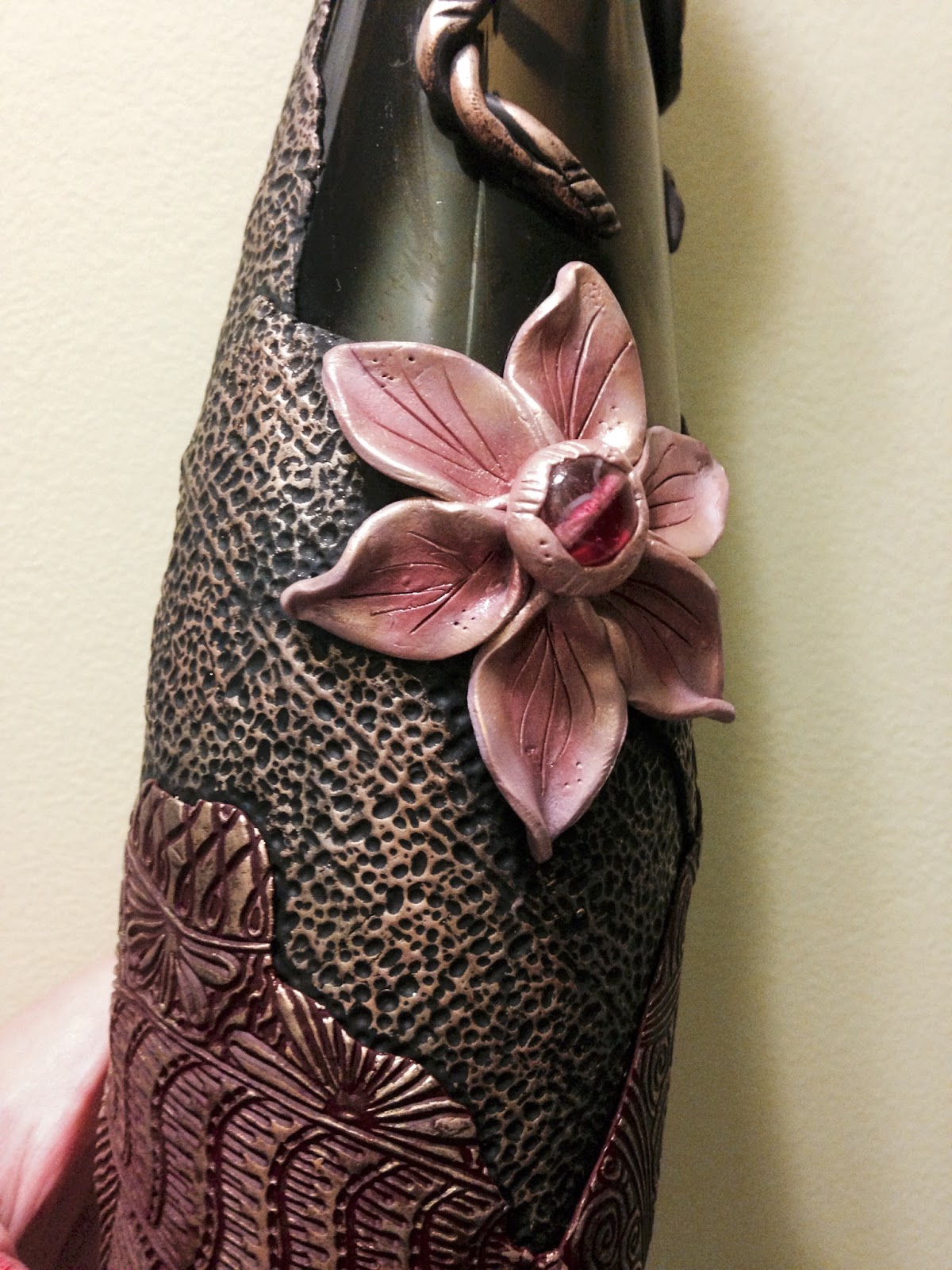 My latest project.  This will be part Polymer clay wine bottle collection. I collected several sizes and shapes of empty wine bottles and I will be working on reusing those bottles to create something unique and beautiful.