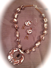 Photo below shows the very first polymer clay jewelry I created. I made clay canes with swirl design using several colours of Premo accent. I cut thin slices of clay canes to cover the pendant and the clay beads and I added glass beads to my design. I created this set for a wonderful friend.