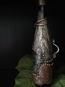 I added flower tie using my extra copper clay at the neck of the bottle. I finished it with German silver gilders paste.