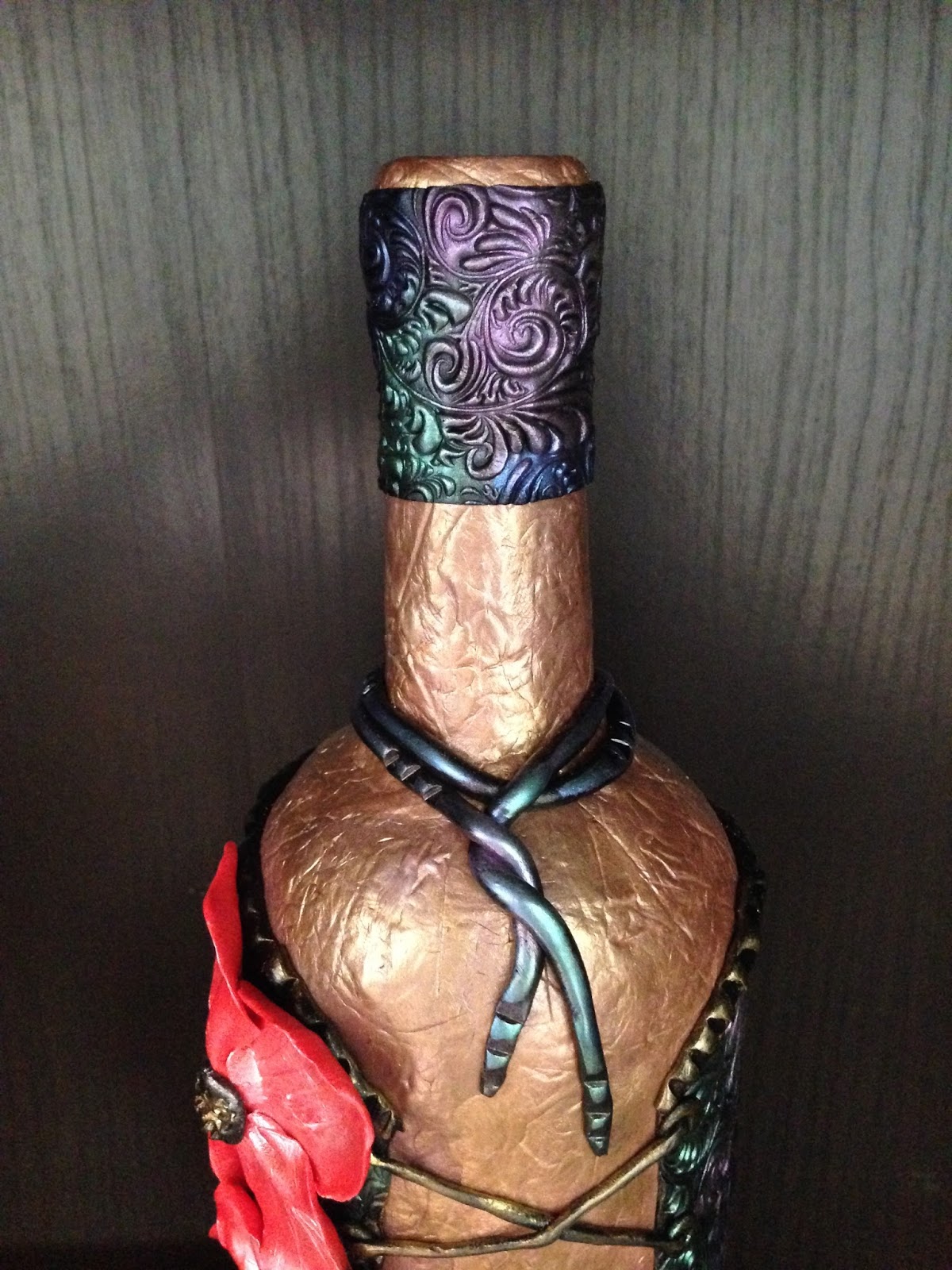 I covered this bottle with copper premo clay as the base and layered it with textured black clay.