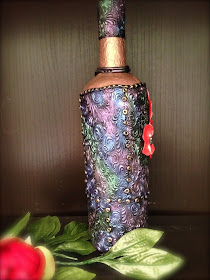 I covered this bottle with copper premo clay as the base and layered it with textured black clay.