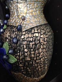 I used textured black clay and layered it all over the vase. I finished it with gilders paste and added the round beads on a painted wire.