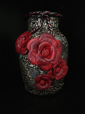 Materials used in this project is clear glass vase, polymer clay (black and red), gilders paste.