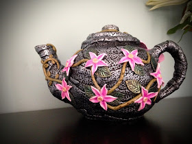 Flowers, leaves and other details were added once the pot was all covered. Then brushed gilders paste to achieve an oxidized metal look.