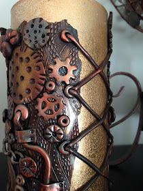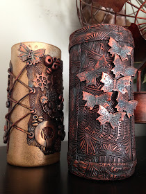 These vases are my version of metallic, steampunk look cylinder shape polymer clay covered vases.
