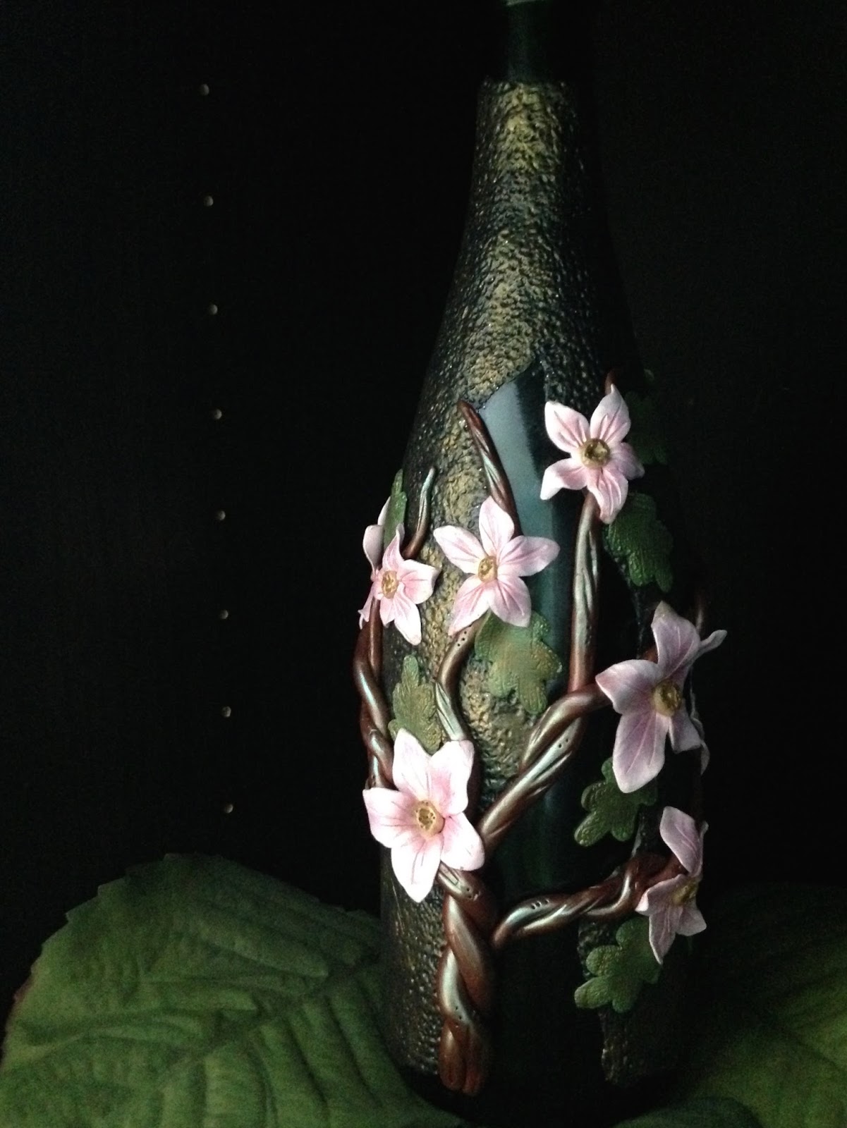 I used white and red clay to create a light pink color. The textured layer on the bottle is made out of scrap clays I have from my previous project and I finished it with Pearl ex powder. It's a beautiful bottle.