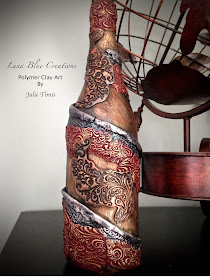 I made five bottles. They are textured, stamped, gilded and one half painted with glass paint.