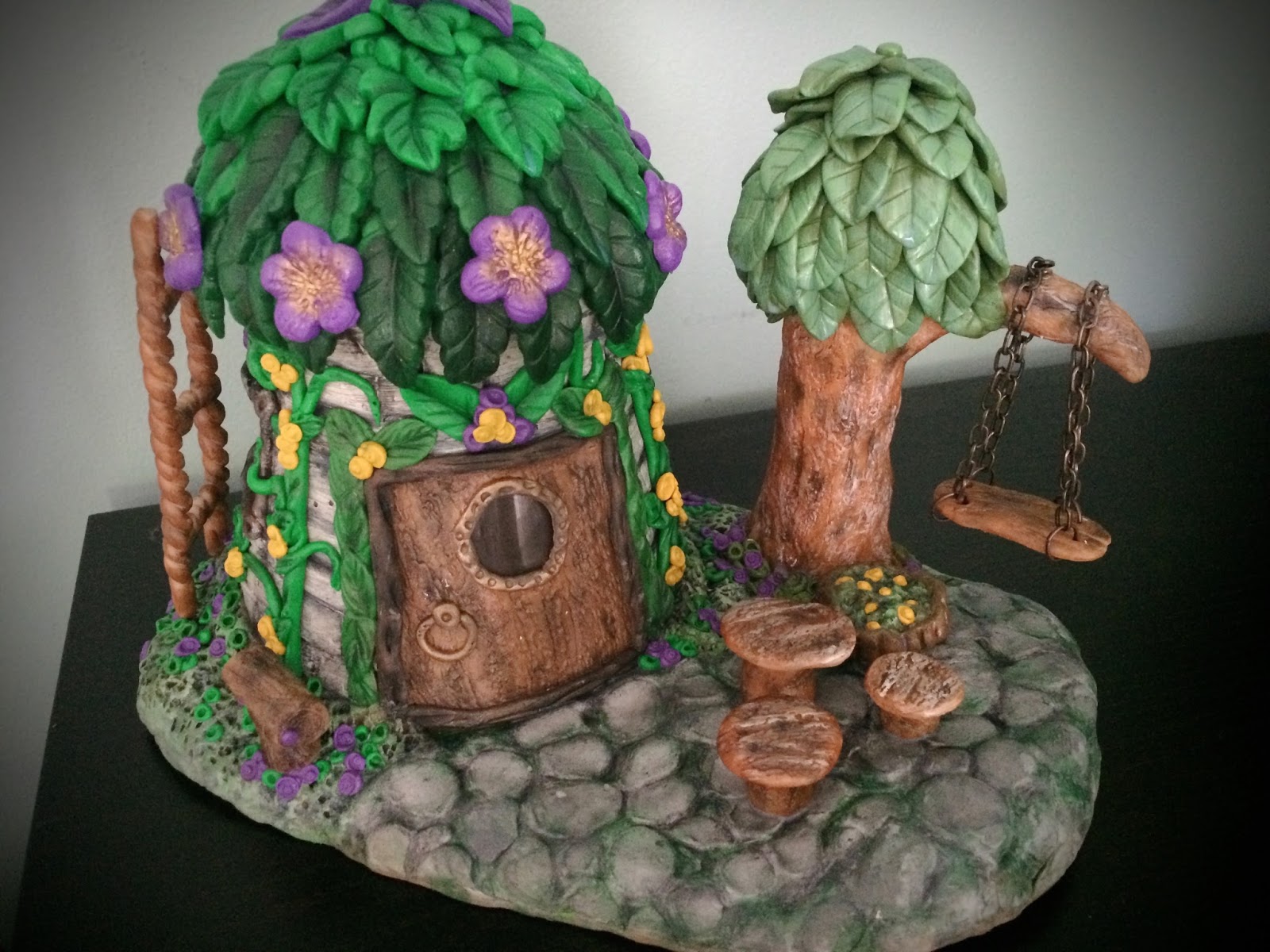I am finally done with my latest fairy house. It is Another pretty addition to my collection. The progress has been slow but I am so happy that I completed it. The basic material used for this house is a small vase, about 4 inches tall, foil for armature and clay.