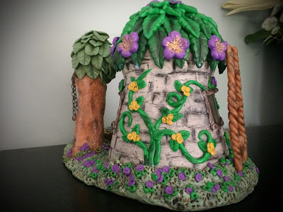 I am finally done with my latest fairy house. It is Another pretty addition to my collection. The progress has been slow but I am so happy that I completed it. The basic material used for this house is a small vase, about 4 inches tall, foil for armature and clay.
